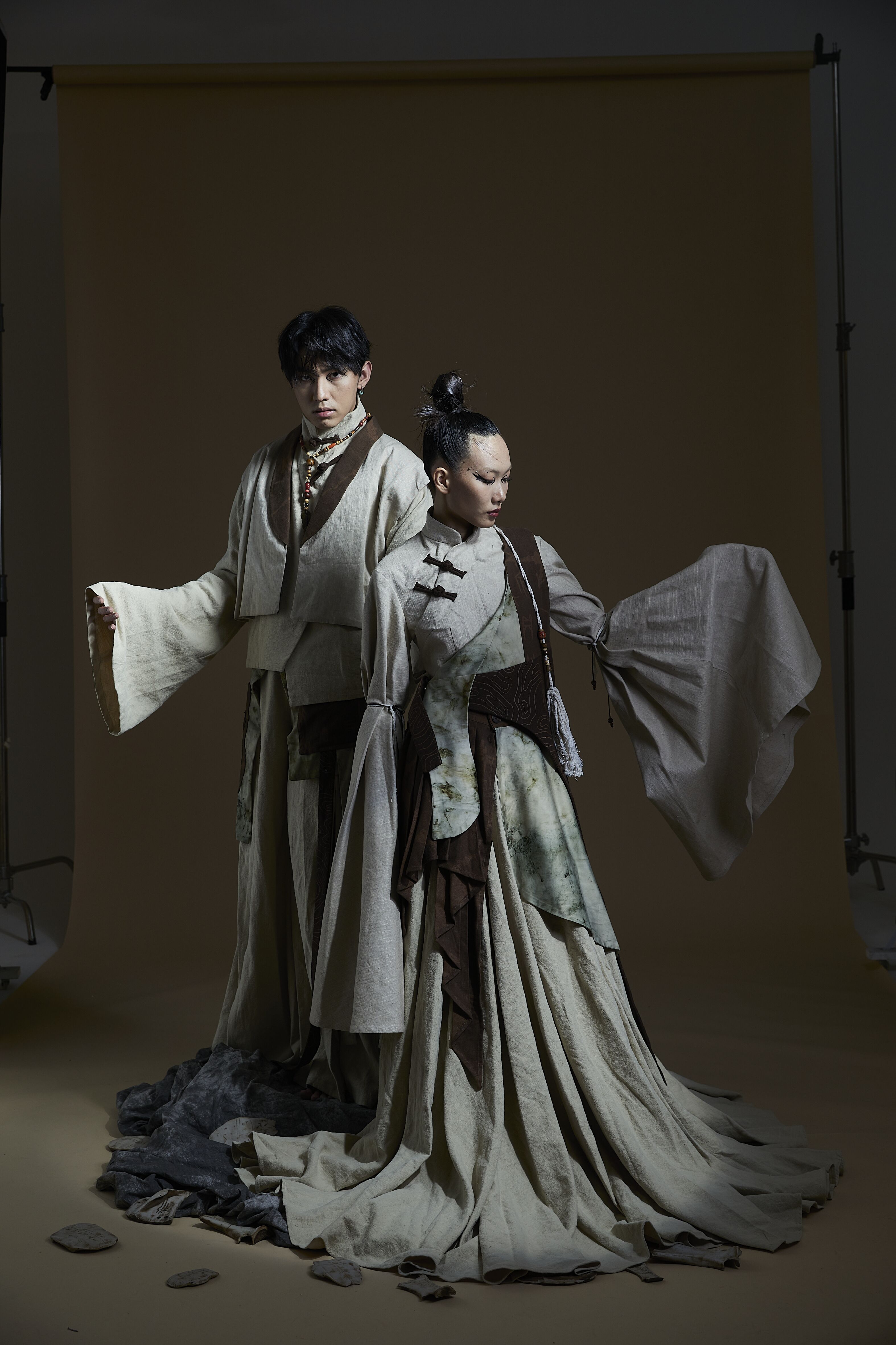 五款设计颜色整体以低调、内敛的米黄色为主,较少的深色系与少量的晕染绿色进行点缀。面料上选用立体感与垂坠感好的相搭配,款式是以中式风格为基础进行改良创作,国风与潮流的碰撞赋予作品独特的韵味。