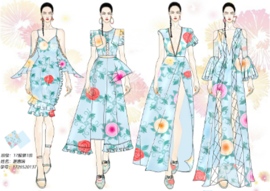 由四方连续绘制出系列化的春夏度假休闲风款式。表达了女性的不俗与知性。